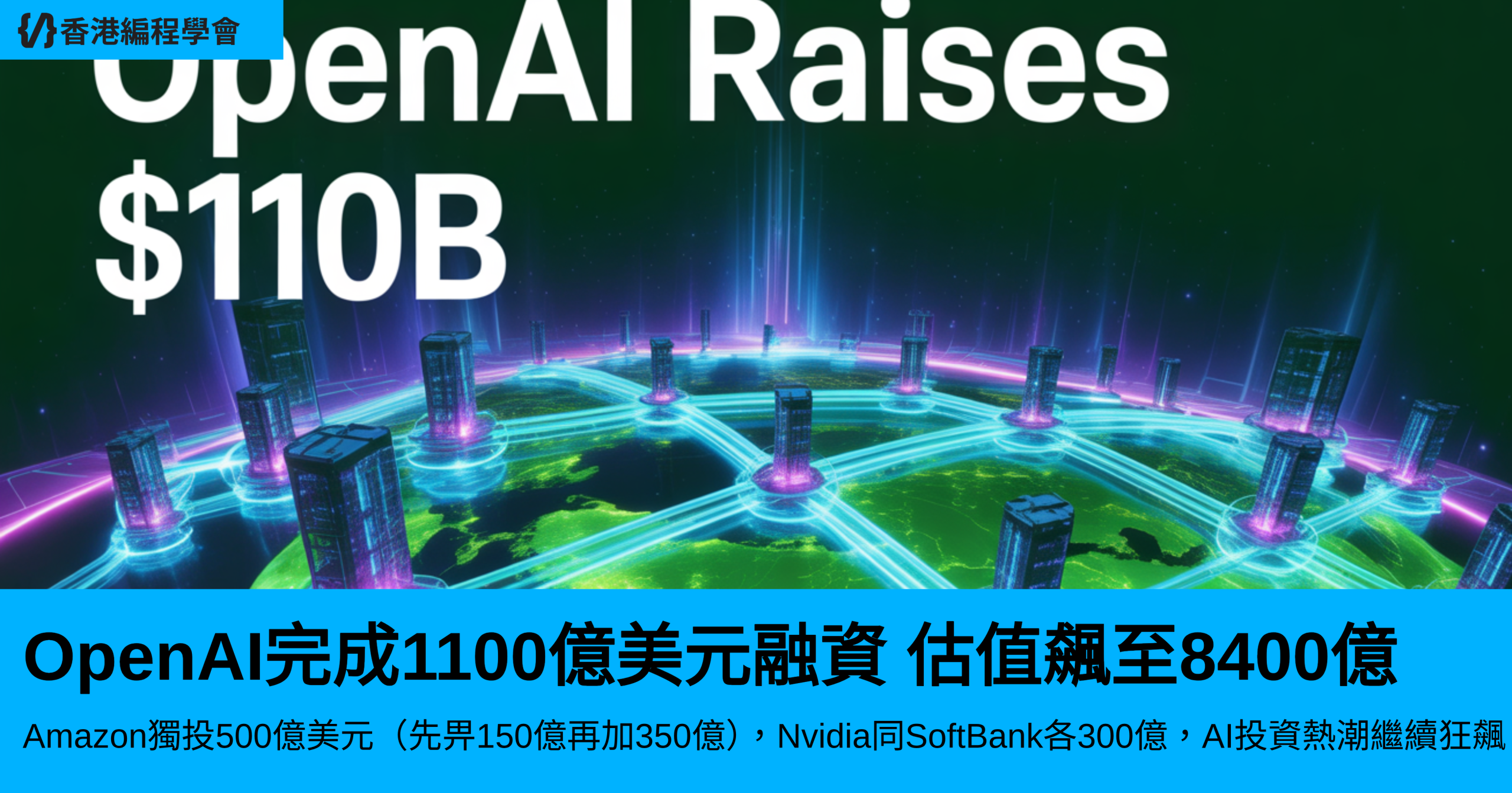OpenAI剛剛宣布完成一輪1100億美元嘅超巨額融資,呢個deal會將佢估值推高到8400億美元。當中Amazon投資500億美元(最初畀150億,之後視乎條件再畀350億),Nvidia同SoftBank就各投資300億。呢輪融資顯示咗人工智能投資嘅瘋狂速度,仲喺AI startup預計今年稍後舉行大型IPO之前。大科技公司同大投資者都搶住同OpenAI合作,因為OpenAI喺數據中心同模型開發上燒咗成十幾億,相信呢啲夥伴關係會畀佢哋喺AI競賽中搶到優勢。閱讀完整報道