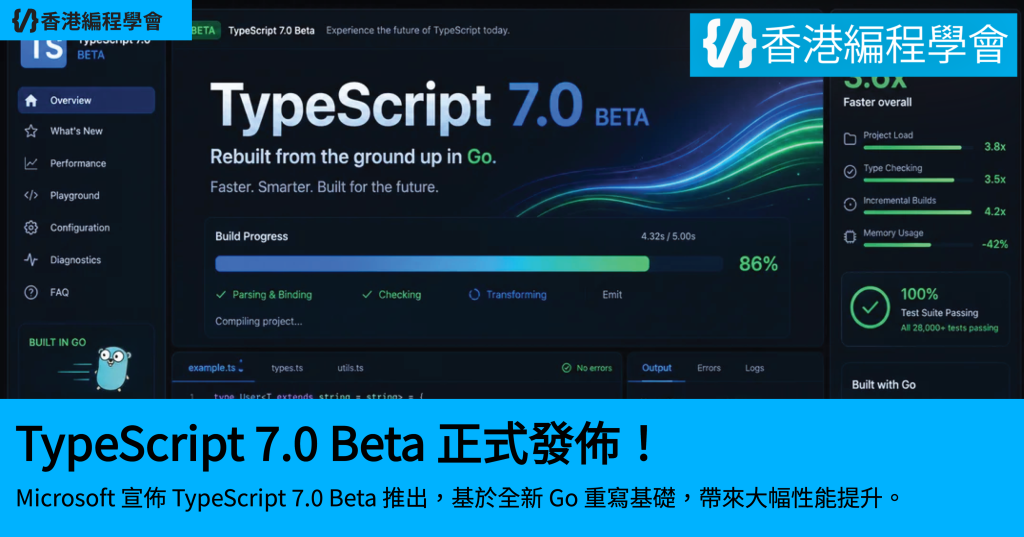 各位 TypeScript 用家留意啦!Microsoft 喺 2026 年 4 月 21 日正式推出 TypeScript 7.0 Beta 版本。今次最大嘅改變就係將整個編譯器同語言服務由 JavaScript 重寫成 Go 語言,結果係 build 速度快咗好多,據講好多情況下快到 10 倍!新版本仲支援原生多執行緒同平行處理,適合大型 monorepo 或者百萬行以上嘅 code base 用。安裝方法好簡單,用 npm install -D @typescript/native-preview@beta,之後就可以用 tsgo 指令代替 tsc 嚟試。VS Code 用家仲可以裝 TypeScript Native Preview 擴充套件,即刻喺 editor 入面感受到加速效果。雖然係 Beta,但核心 type-checking 邏輯同之前一樣穩定,已經喺好多大公司內部實測