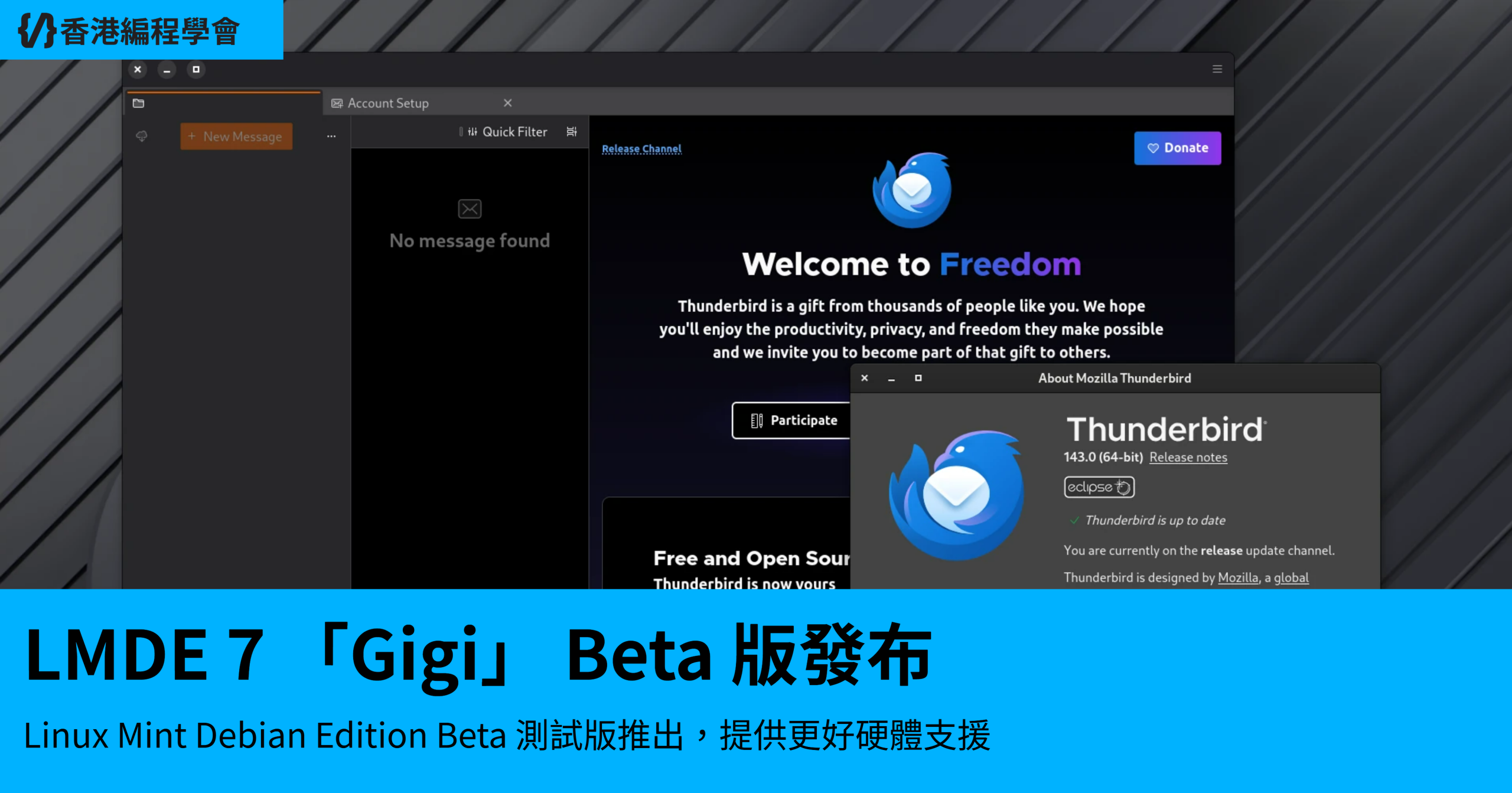 LMDE 7 「Gigi」 Beta 嚟咗!呢個版本用咗 Debian 13 「Trixie」做基礎,仲有 Linux kernel 6.12,硬體支援更好,筆電性能提升,相容 Intel Arrow Lake、Lunar Lake、AMD RDNA 4 同 Raspberry Pi 5。
