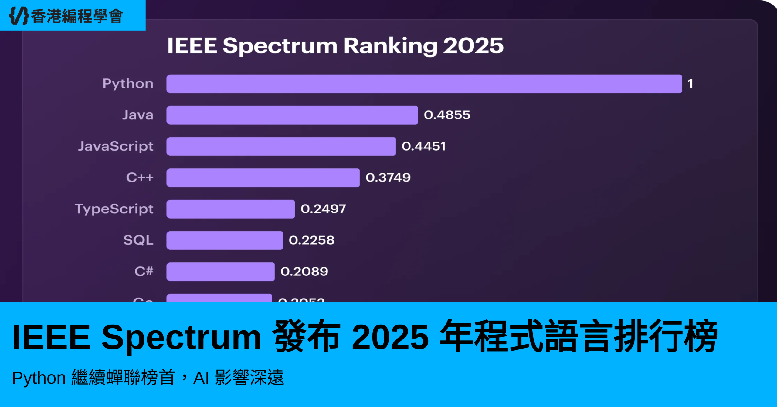 IEEE Spectrum 啱啱出咗2025年嘅程式語言排行榜啦。Python 又一次攞咗頭位,呢個已經係連續第二年霸住第一位。