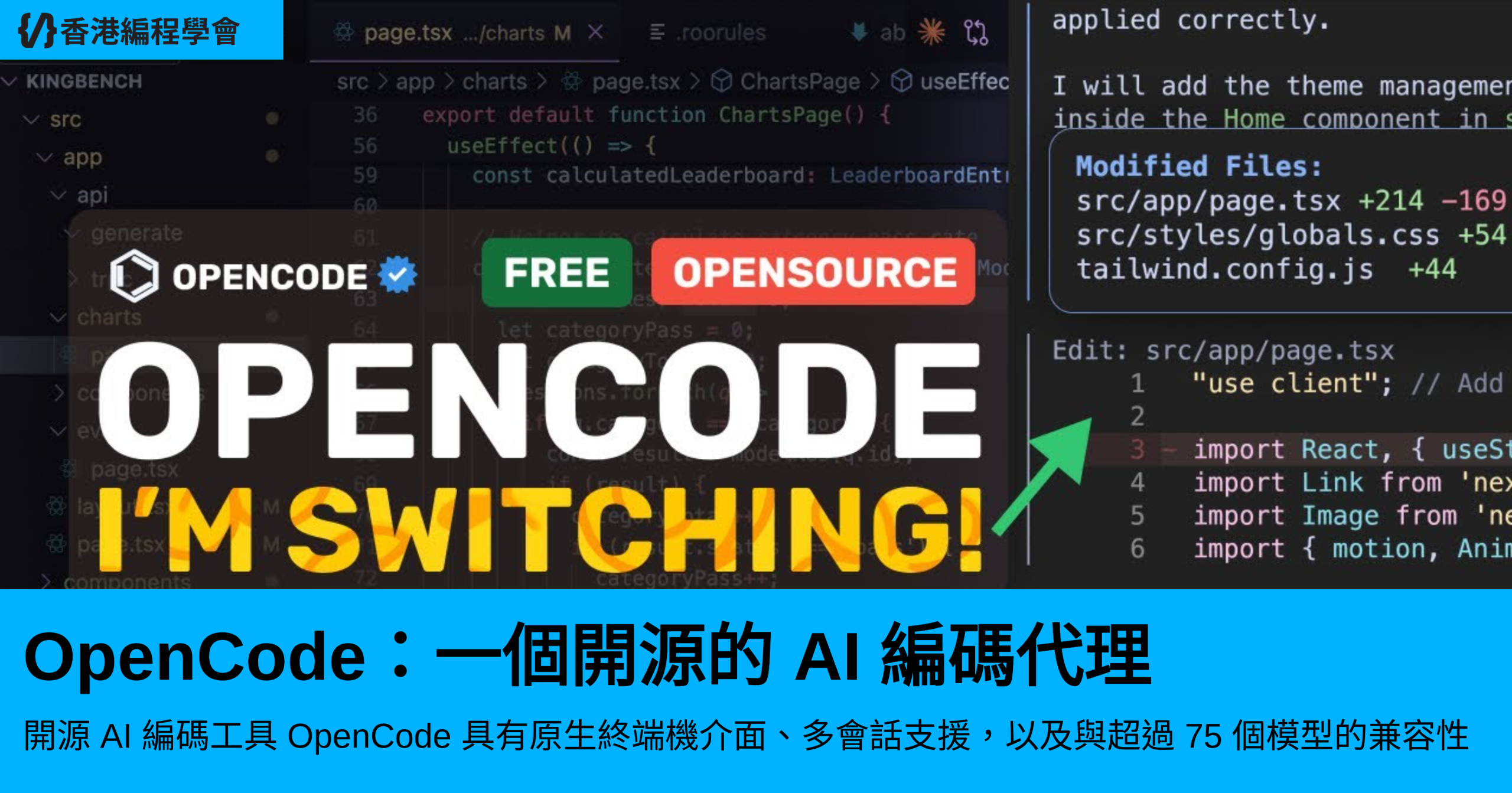開源嘅 AI 編碼工具 OpenCode 有原生終端機介面、多會話支援,同埋兼容超過 75 個模型,包括 Claude、OpenAI、Gemini 同本地模型喎。除咗 CLI 工具,OpenCode 仲可以當桌面 app 同 IDE 擴充,用喺 VS Code、Cursor 等工具度啦。OpenCode 畀開發者用佢哋現有嘅付費服務訂閱,例如 ChatGPT Plus/Pro、GitHub Copilot。