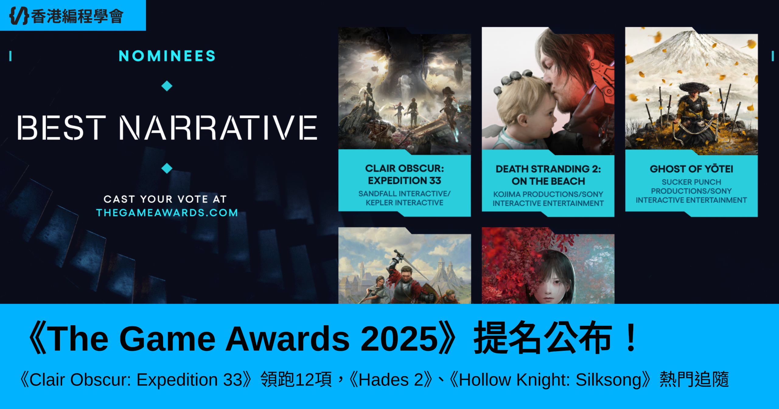 年度遊戲大獎(GOTY)提名人選有:《Clair Obscur: Expedition 33》、《Death Stranding 2: On the Beach》、《Donkey Kong Bananza》、《Hades 2》、《Hollow Knight: Silksong》、《Kingdom Come: Deliverance 2》,競爭真係好激烈呀!