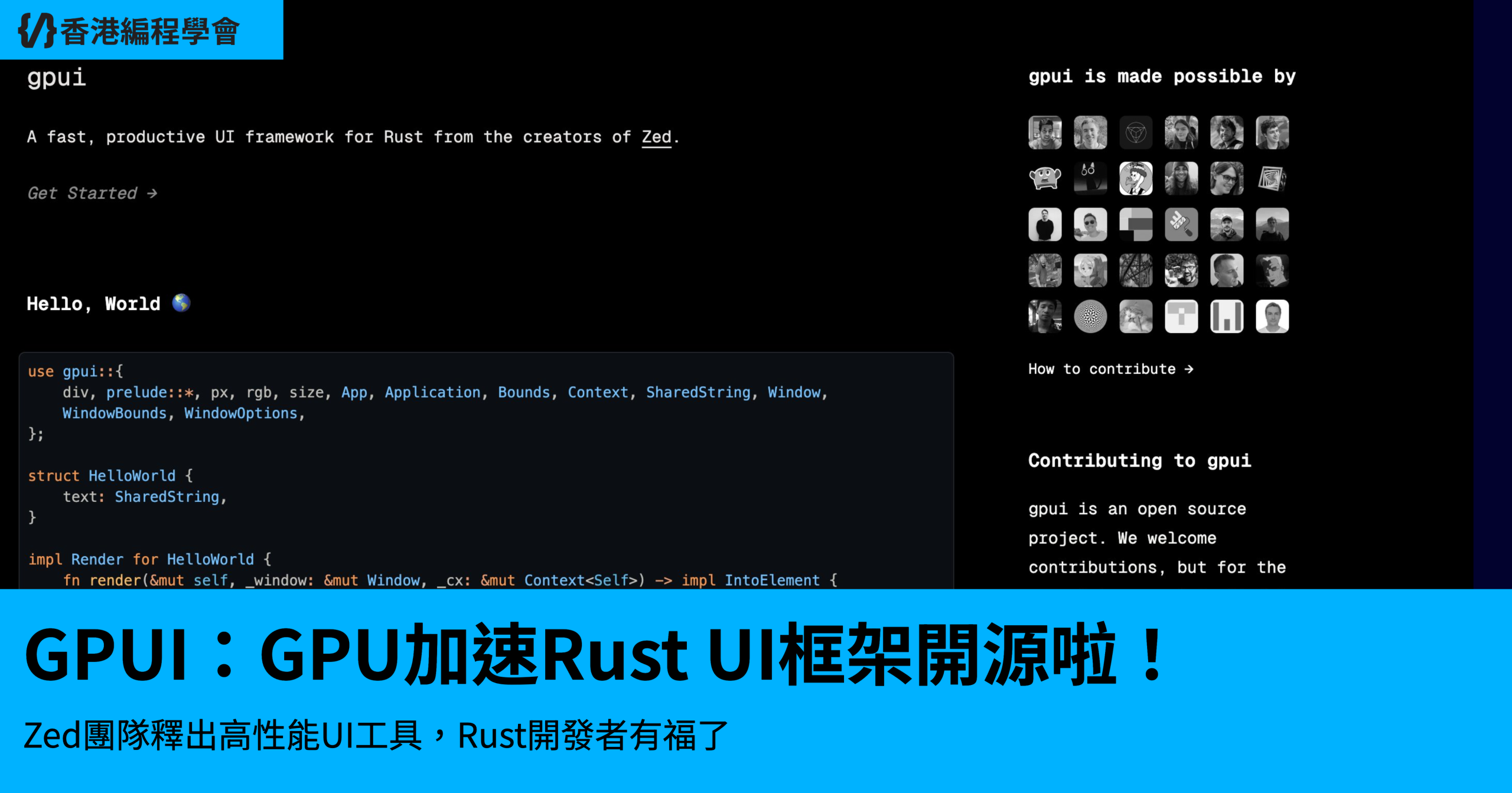 Zed嘅開發團隊近日將佢哋嘅GPUI框架開源咗,呢個係一個用Rust寫嘅GPU加速UI框架,專為高性能桌面應用而設。