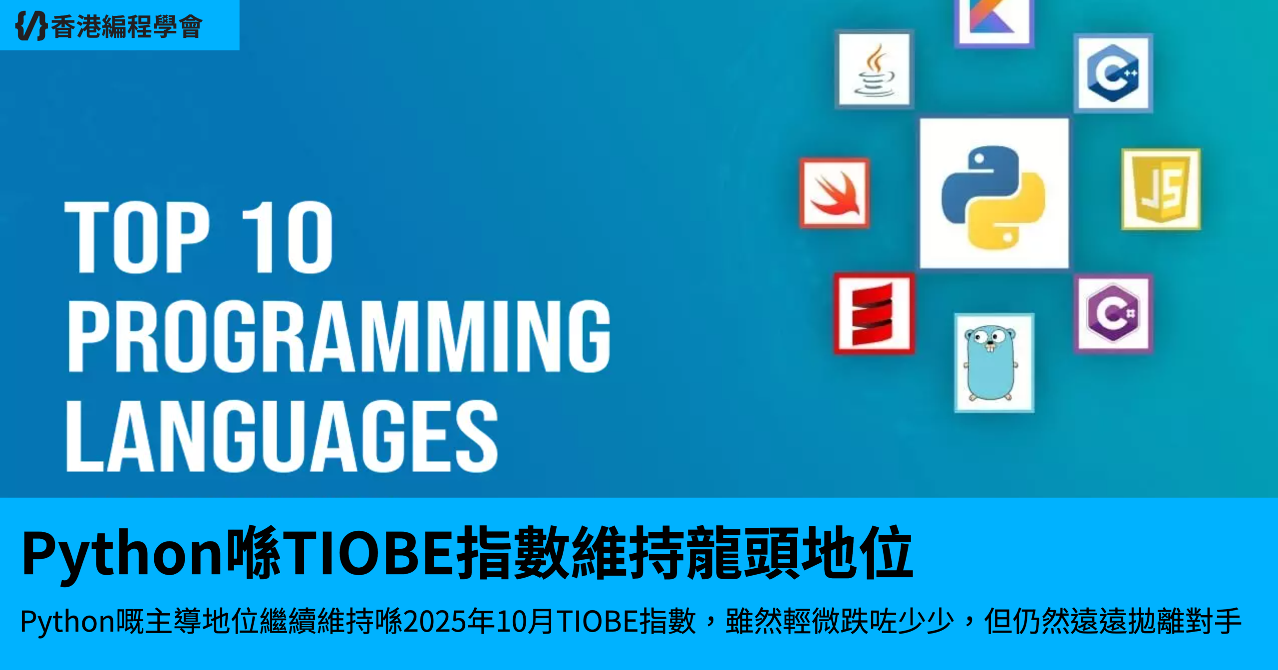 Python嘅霸主地位喺2025年10月TIOBE指數繼續維持,雖然由25.98%輕微跌到24.45%,但仍然遠遠領先對手。TechRepublic讚揚Python喺AI、數據科學同埋易學方面嘅角色,同埋年比年增長2.55%。呢個指數基於搜尋引擎數據,顯示Python仍然係最受歡迎嘅程式語言。