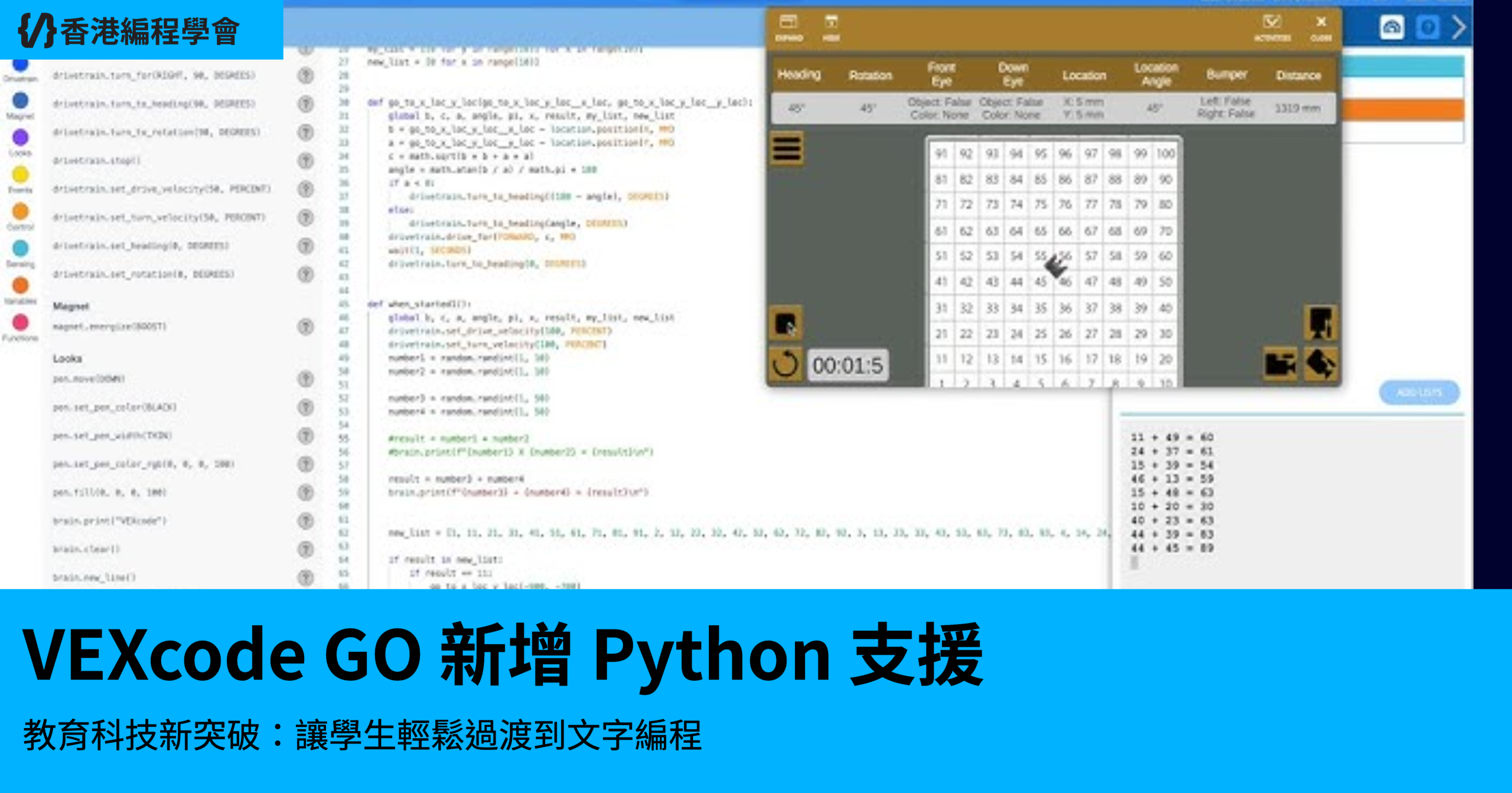 VEXcode GO 呢個教育機械人編程平台,最近加咗 Python 支援,專為小學生設計,畀佢哋可以用積木式同文字式編程一齊玩,唔使再怕轉換麻煩。